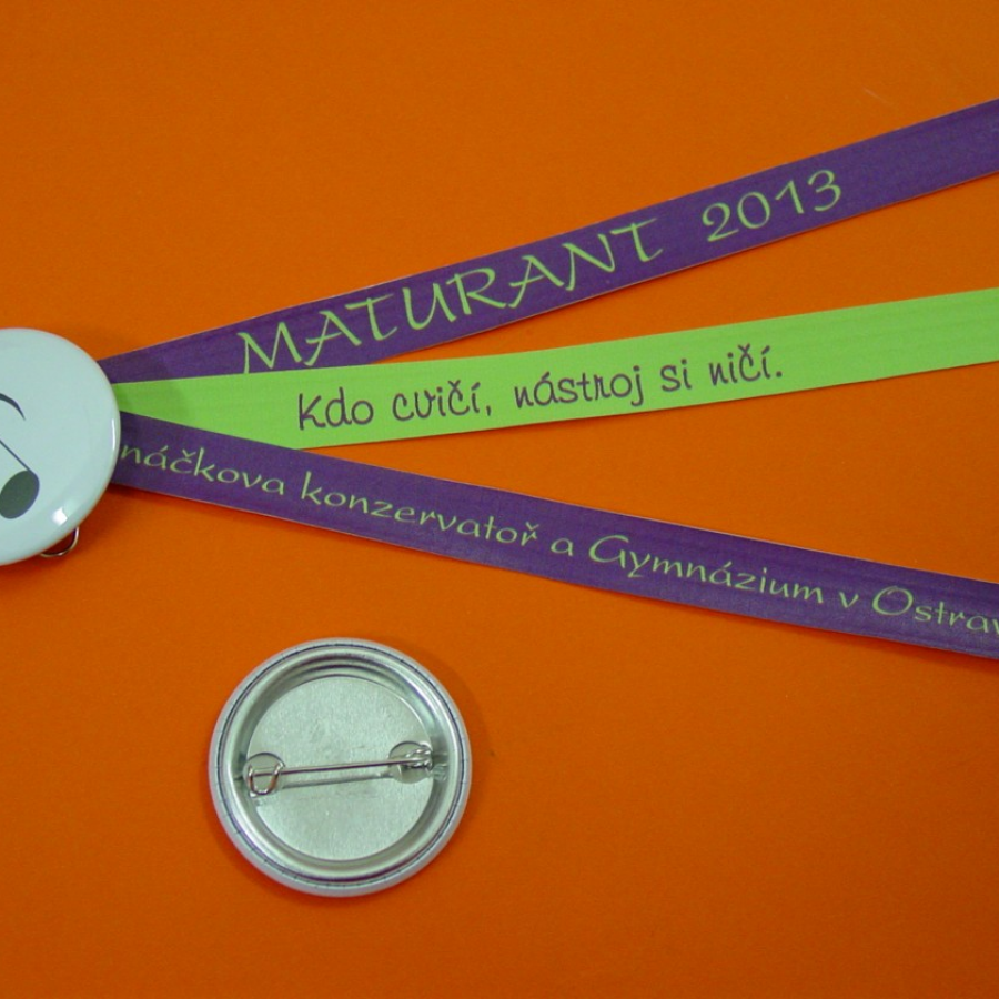 Jsme schopni vyrobit na míru maturitní stužky v "xy" barevnostních kombinacích vč. sponky pro přišpendlení na oblečení, batoh aj. vč. vyseknutí špiček na stužkách. Toto vše v řadě barev, typech písem a sloganů. Velmi oblíbená položka možnost kombinovat s maturitními plackami či buttony.